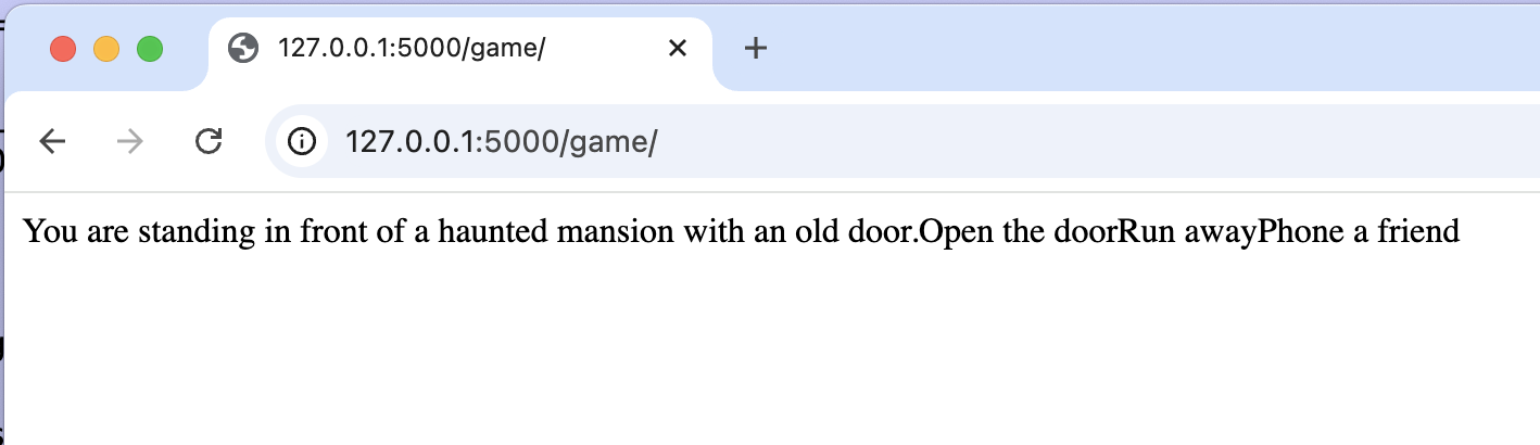 (jump back up to table of contents)Before we can make the choices clickable, we have to make it so that this program will dynamically return any specified game state. Right now we don't have any way to specify a game state. Here is how you do that in Flask: