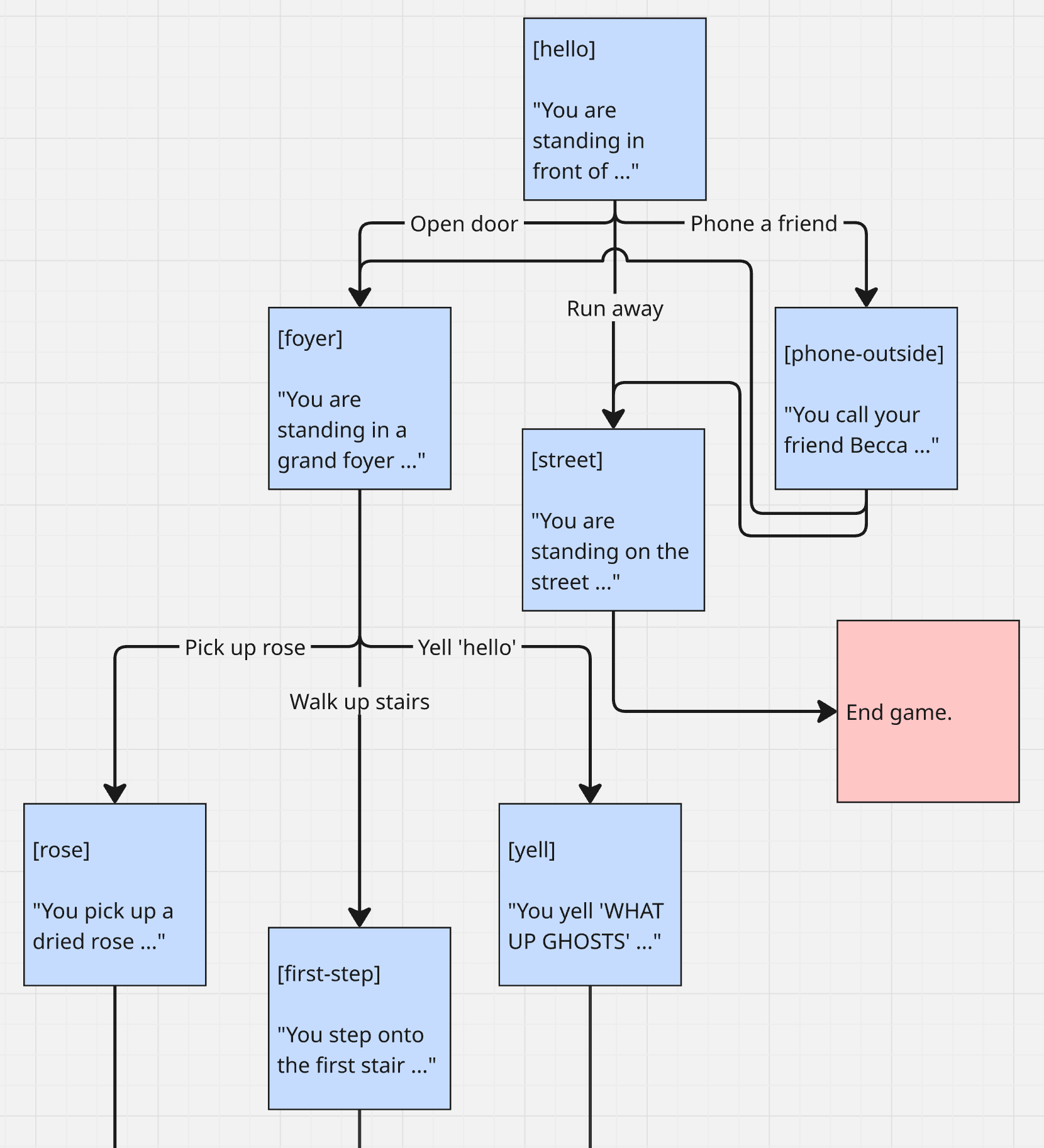 The goal here will be to make a "choose your own adventure" game, of the sort commonly presented in book form, implemented here as an interactive program with a text-based user interface (the command line).