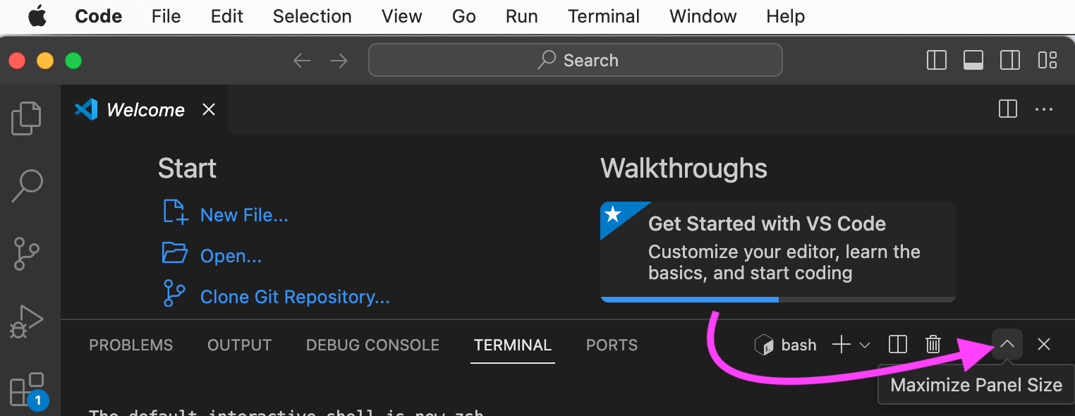 For now, since we will only be working in the terminal and not yet working on any code files, expand the terminal window by clicking on the little up arrow: ^