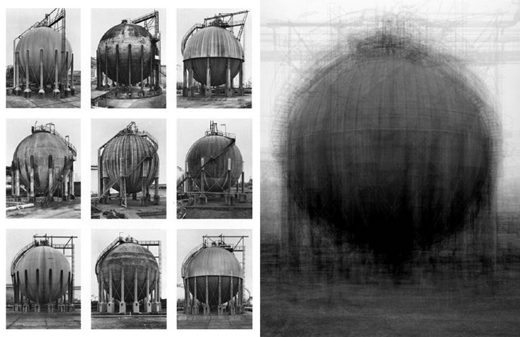 The image on the right is by the artist Idris Khan. Khan takes collections of the Becher images (and other images), adds transparency, and layers them. In this way, it's like he is creating one image that shows us a fuzzy portrait that depicts the range of all possible items in a collection. One image of a gas tank that somehow portrays all possible gas tanks. We'll start with the Becher approach today and in your homework you will end with Khan's.