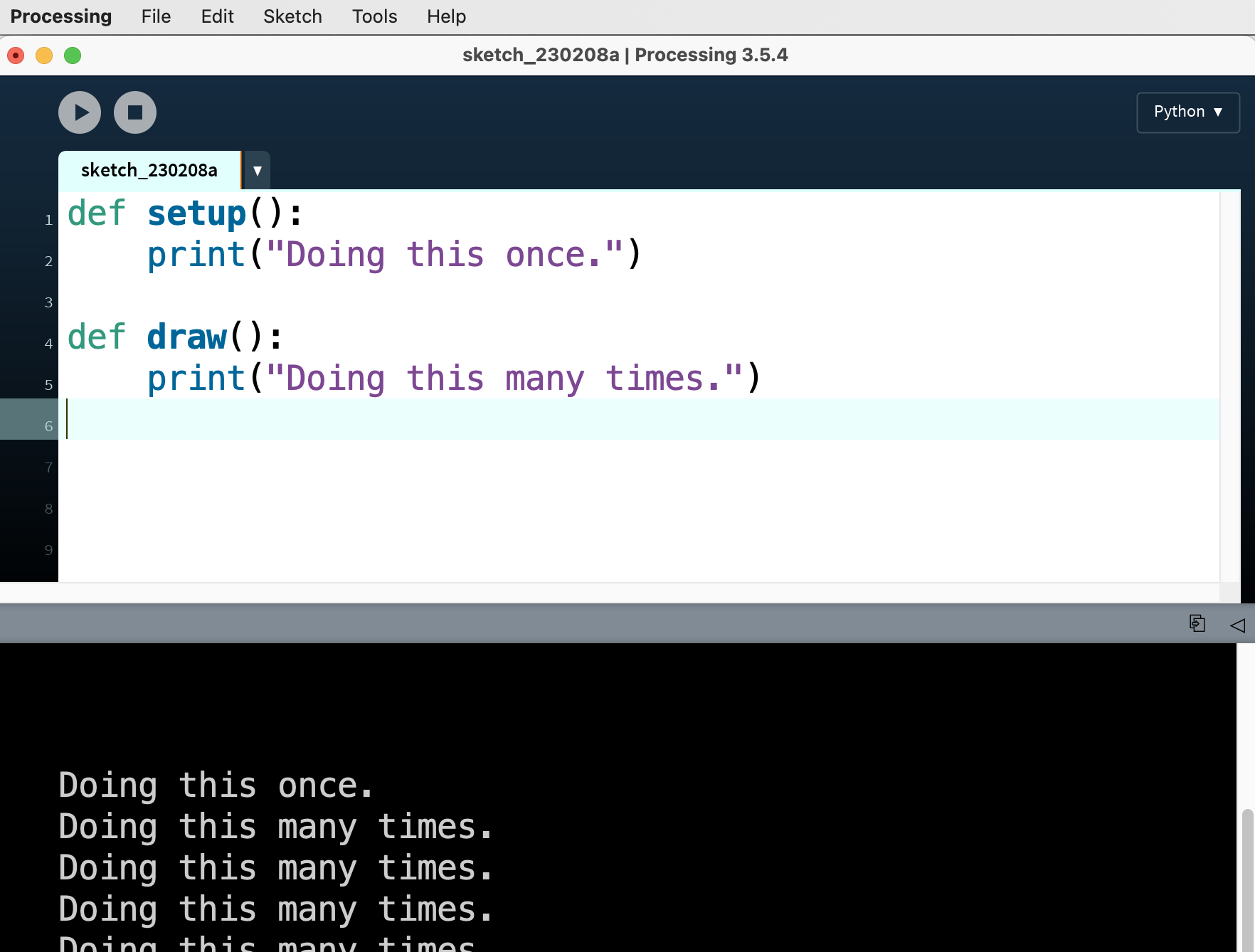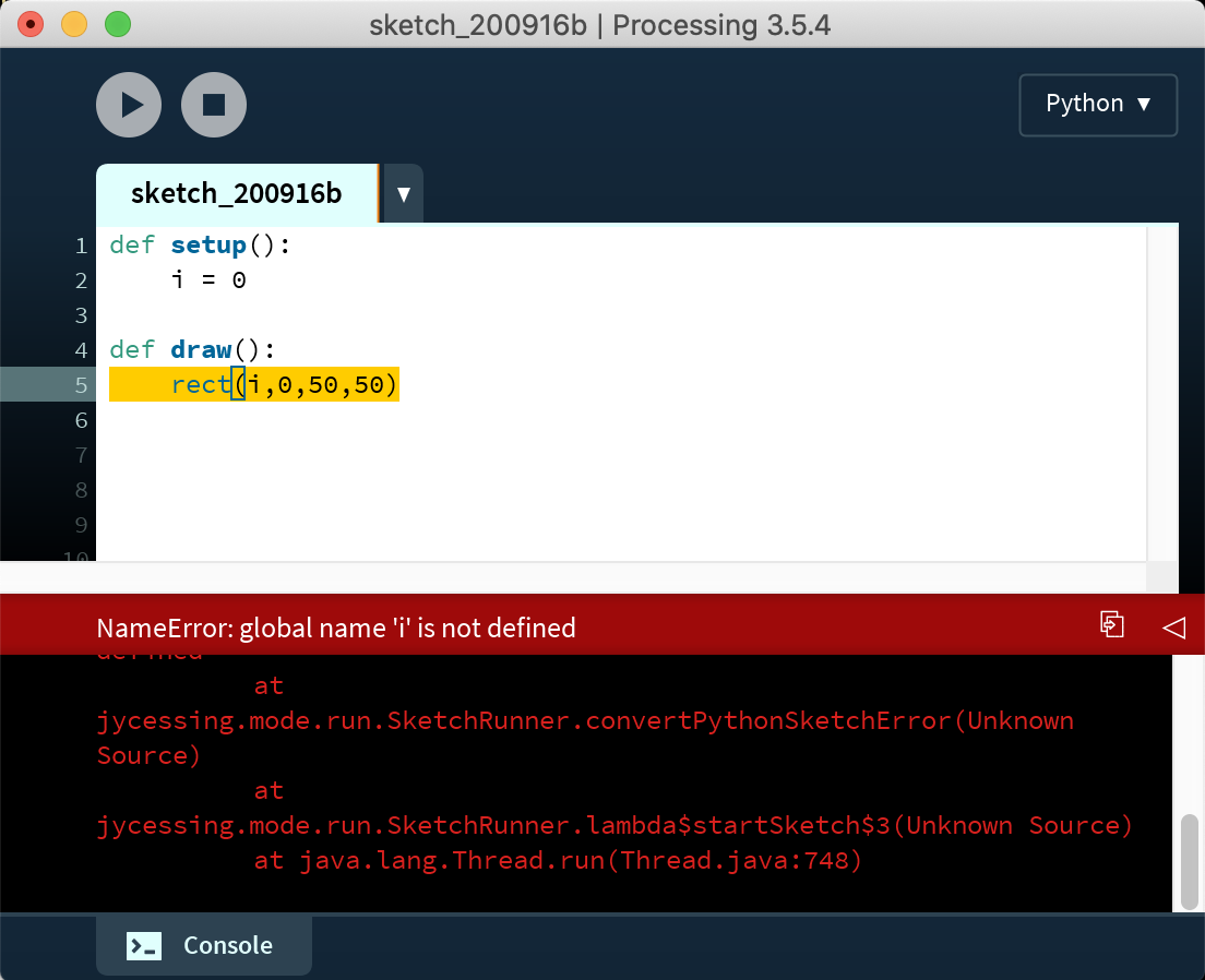 Now that we have introduced this new syntax, you have to pay close attention to indentation: the amount of spaces at the start of each line. Last week I told you that Python and Processing don't care about whitespace (spaces, newlines, tabs) and this is mostly true. But the one situation in which Python requires you to be very precise about whitespace is with indentation.