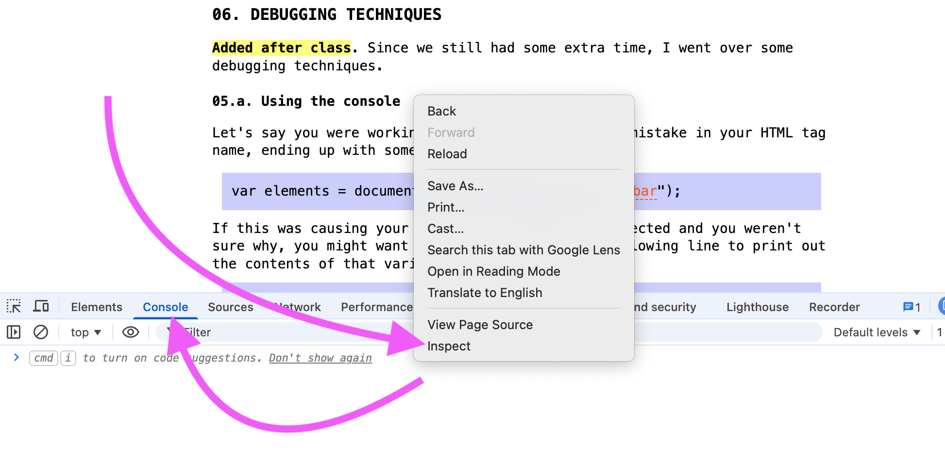 Added after class. Since we still had some extra time, I went over some debugging techniques.