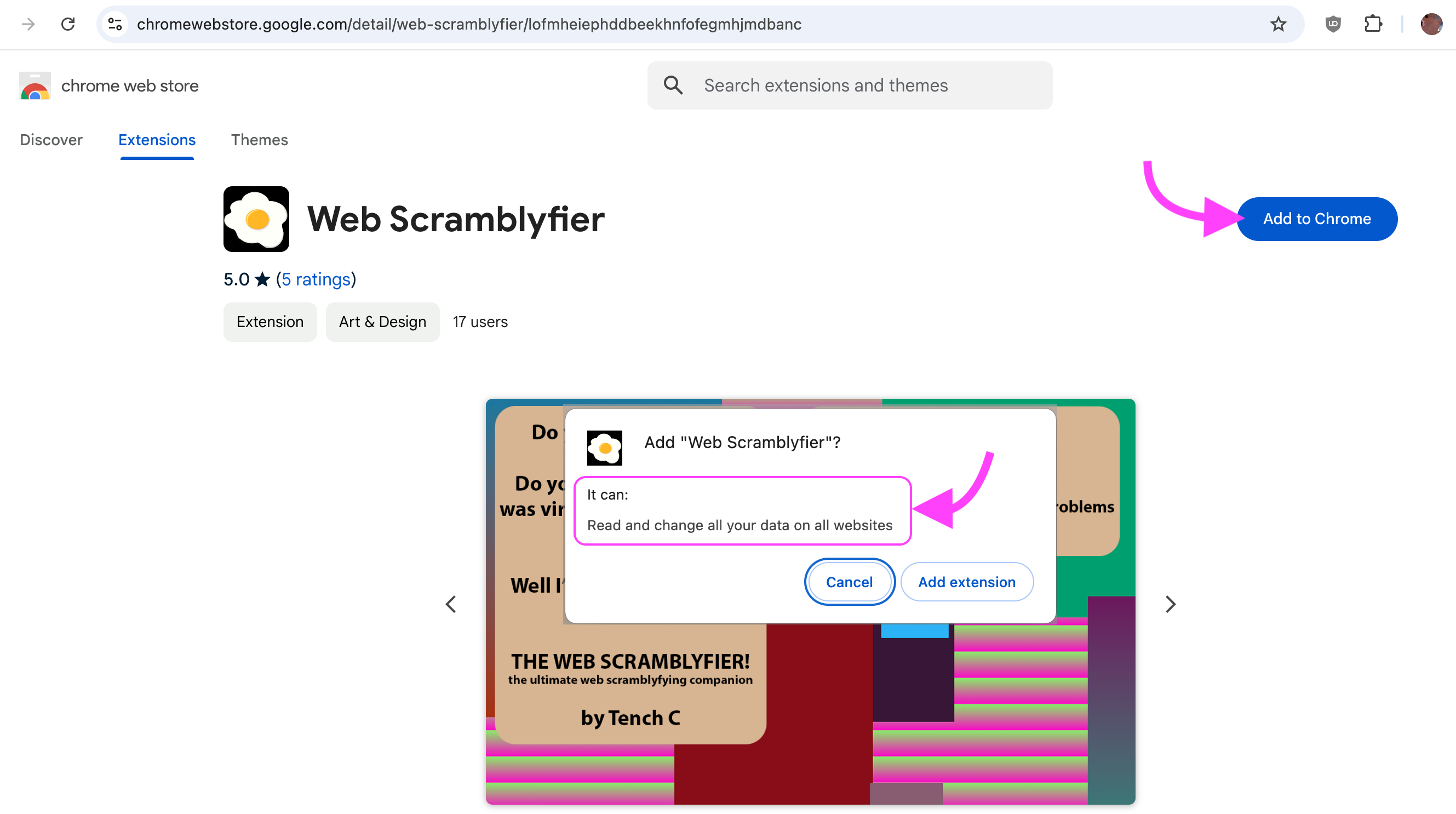 informative popup, when a user clicks "Add to Chrome", that