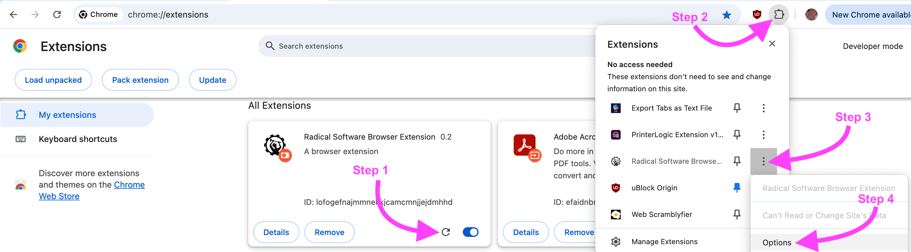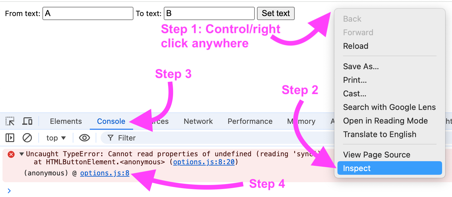 We have not yet implemented any code to actually use these values, but even before we do that, we should be able to test this first part of the functionality. Save all your files, reload your extension (step 1 below), and from the Chrome extension menu (step 2), click the three dots (step 3), and click "Options" for your extension (step 4). Like so: